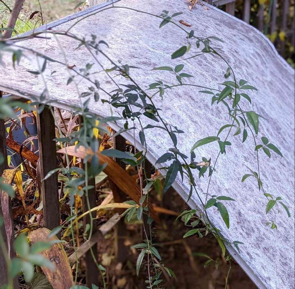 それがドッグランの中の犬のハナの夏の日除けに立てかけてある板の上に丁度かかって、素敵でした。