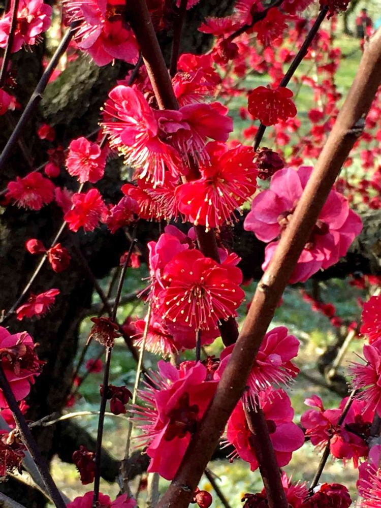 おはよう🙇ございます。最近、黄色、ピンク、ホワイト、他、しか👀を向けてなかつたので点在する、梅の中にも本当の赤、濃赤?美しさ抜群、⤴️テカリも入りこんでないし描写角度も良いと思います。赤っていいよね🙇