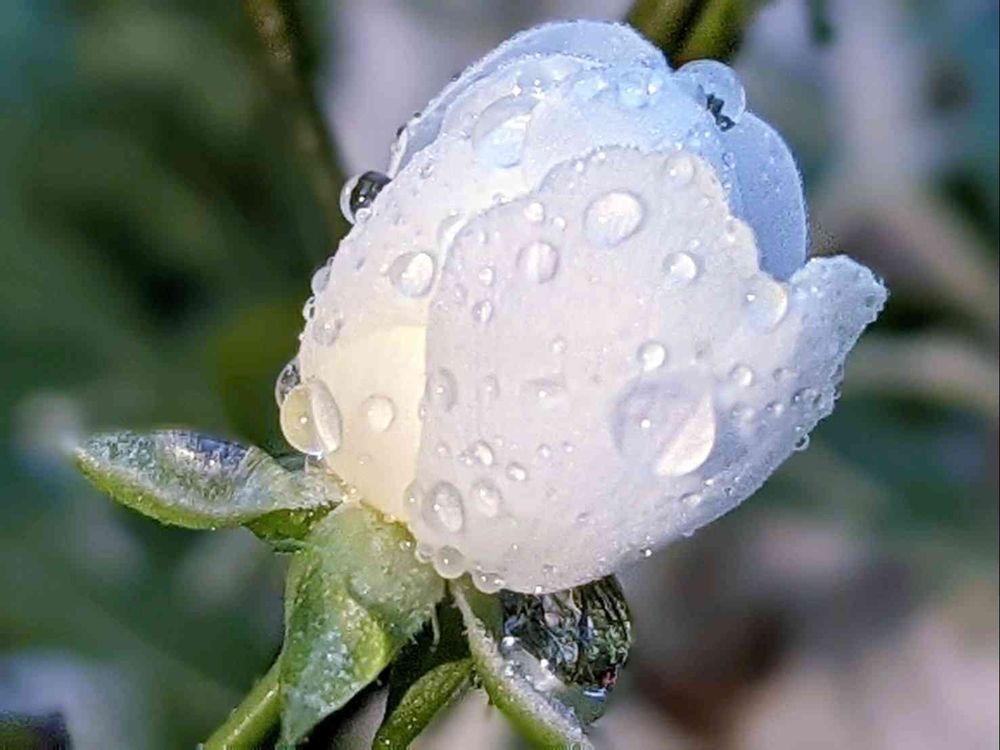 ようやく咲いて来た白いミニバラ…昨夜の雨粒で飾られて…。