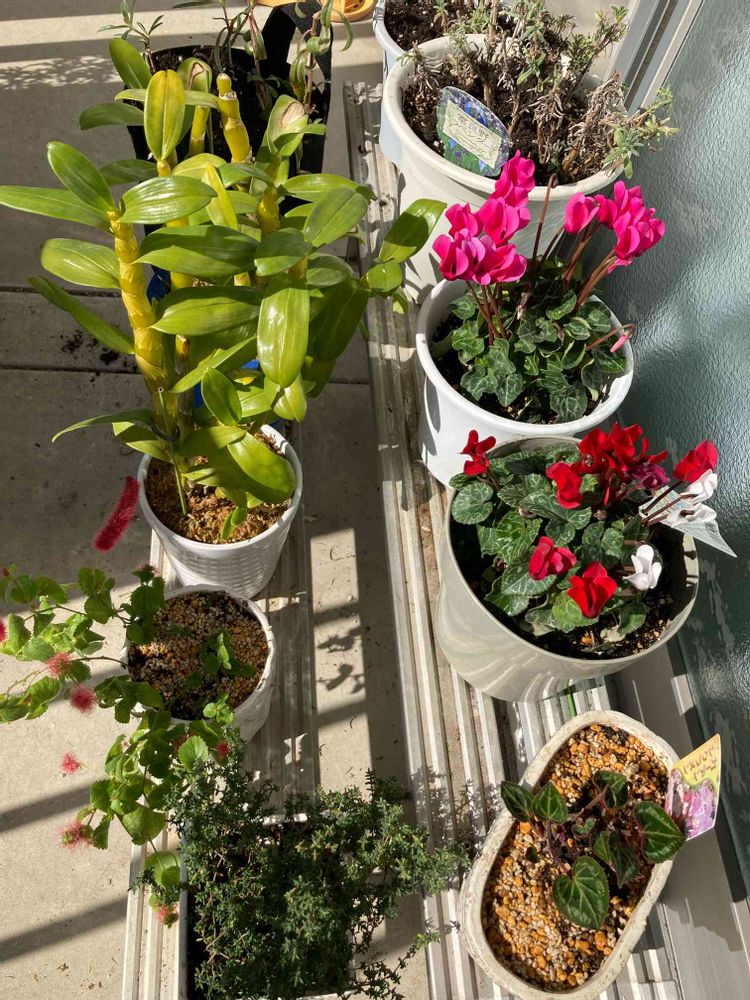 ベランダがにぎやかになって嬉しい😆シクラメンのパワーでしょう赤白ピンク