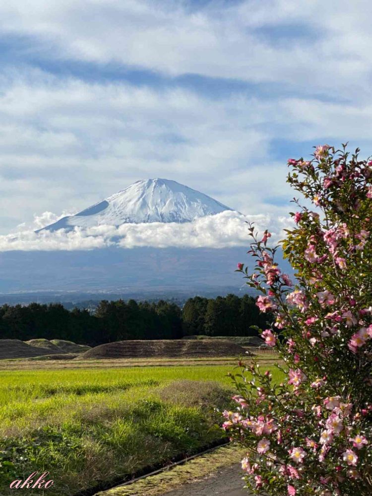 雲があって頭を出している富士山🗻なんて珍しい感じですね♪山茶花もたくさんお花をつけていてきれいですね〜😊