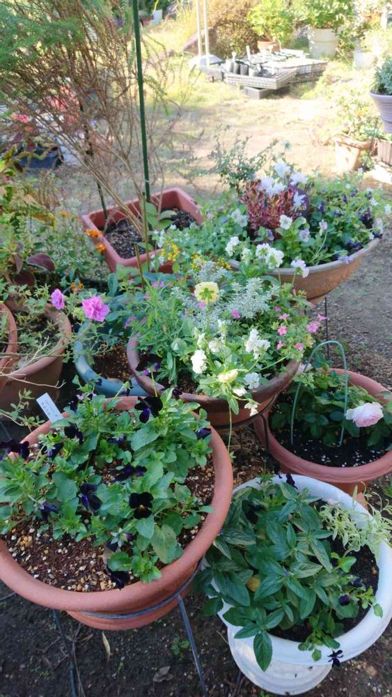 手前の黒いビオラの鉢はダブルデッカー植えしてみました(真ん中に黄色のチューリップ5球植えました、外のあいているスペースにイキシアの球根が2球ずつ合計8球植わってます)春にどんな風に咲くのか楽しみでワクワク😃💕
