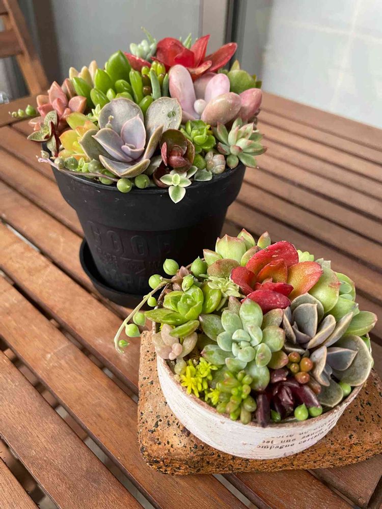 久しぶりに多肉寄せ植え♪ 2鉢を一気に作って気づけば夕方。やっと自分なりの手順がわかってきた感じです。