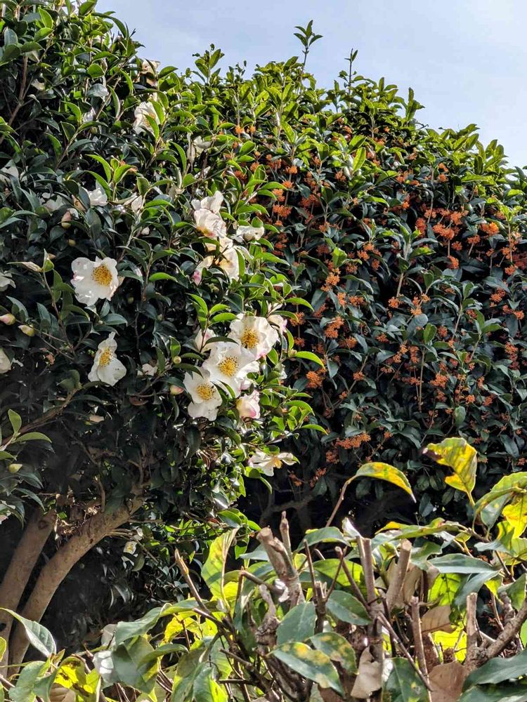 生け垣から覗く🤍サザンカ🤍と🌸キンモクセイ🌻