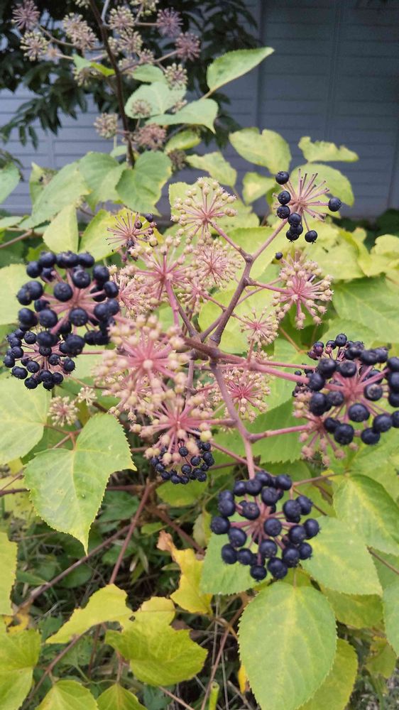 ウドの花は雄花序と両性花序があり、大きな両性花序の下側に小さな雄性花序がある🙂。