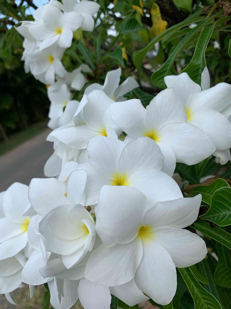 花びらが重なるように咲くプルメリアさん、先がスペードのような形で細長い葉っぱです〜♤