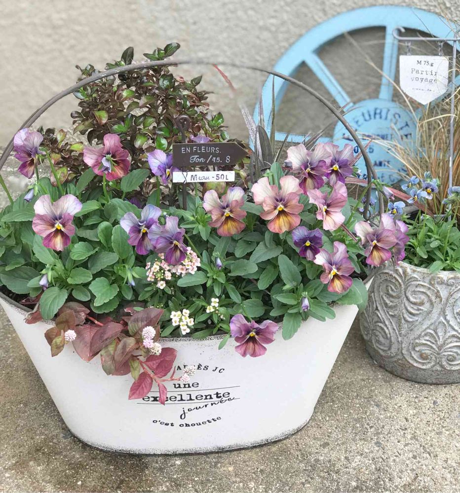 ビオラ花色、ブリキ鉢に合ってキャワゆい😍