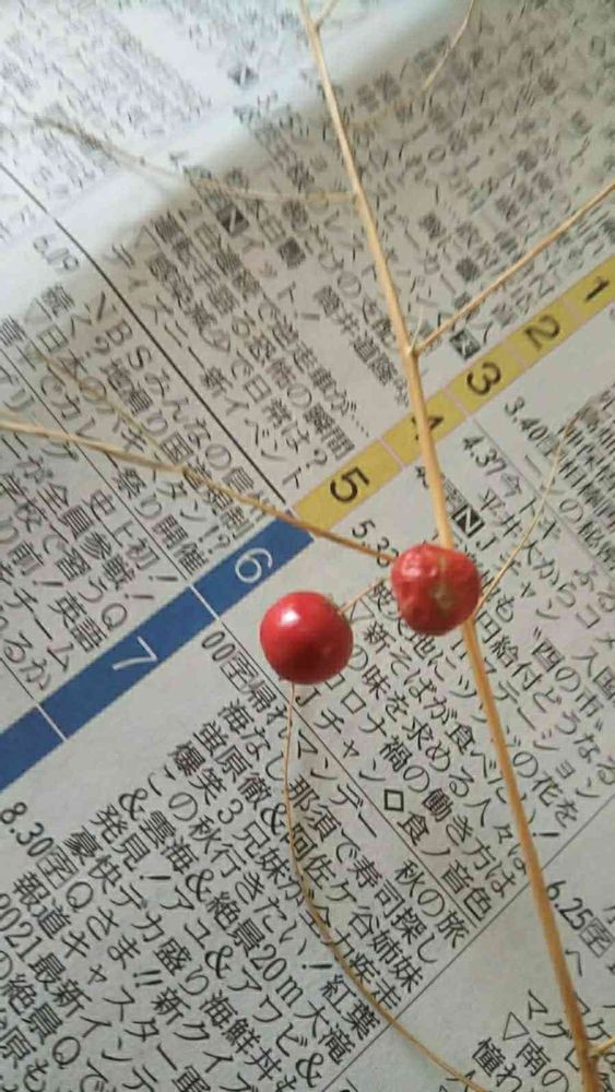 庭先の片付け、アスパラガスの枯れ枝に赤い実がありました。