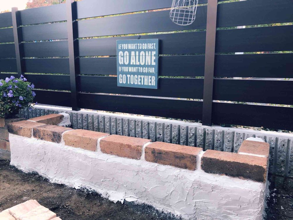 ベンチ兼花台のブロックに白いモルタルを塗りまして、レンガを載せました♪