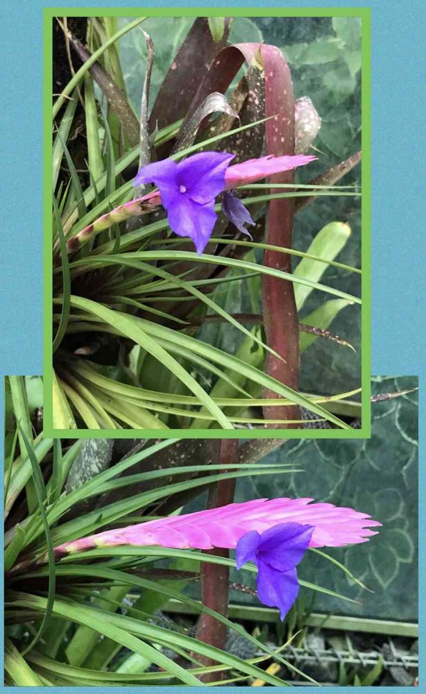エクアドル原産のチランジア・リンデニー。ピンクの編み込みのような苞から薄紫の花を横につけています。エアープランツのため根はあまり発達せず、他の木などに着生する植物です。