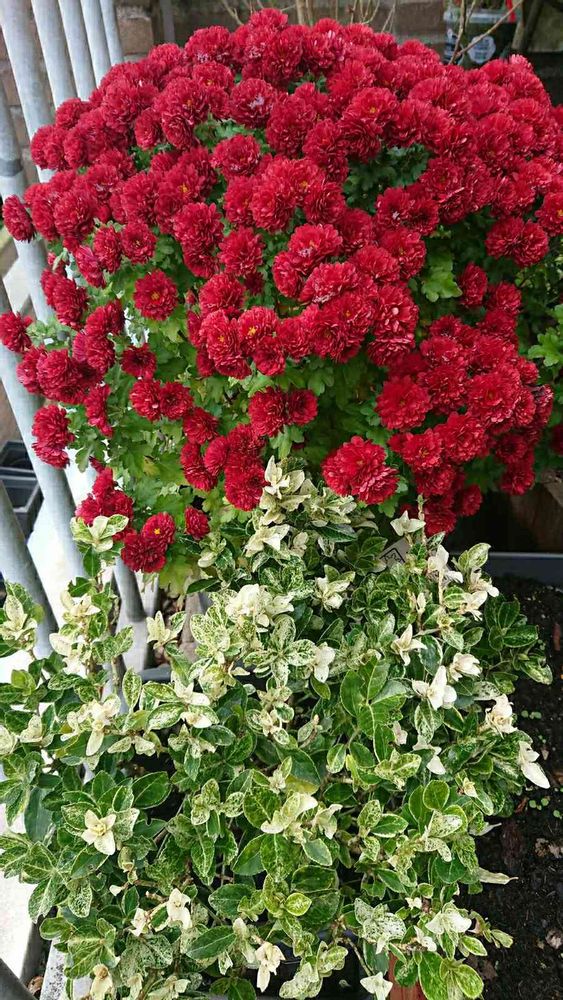 落葉樹は葉を落とし、多年草も地上部が枯れてしまうこの季節、バルコニーのこの柾と菊一画だけが華やかです🇳🇱
