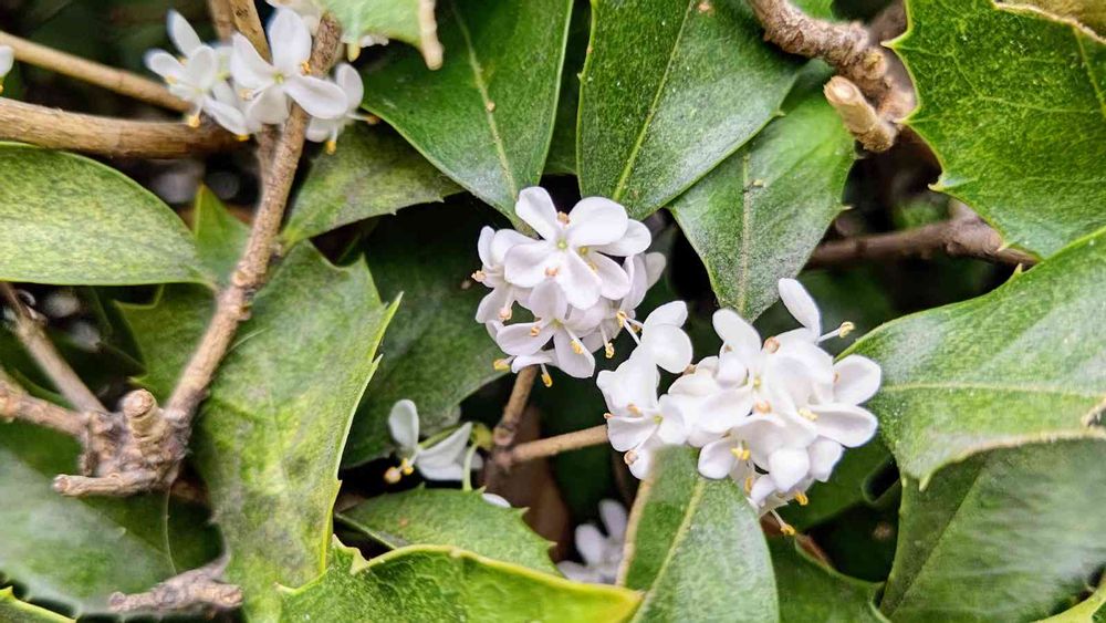 柊と銀木犀の交雑種🌳。花は金木犀や銀木犀と同じ形。柊よりトゲは痛くないです😊