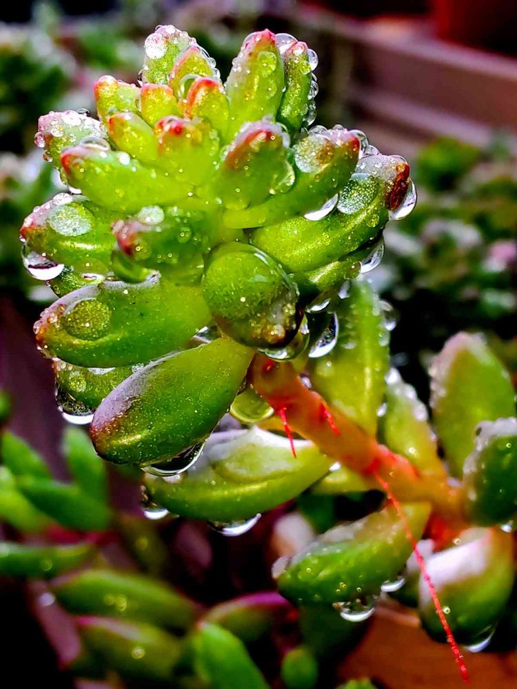 雨粒宝石を纏った セベデリア・ホワイトストーンクロップさん😻💚❤️