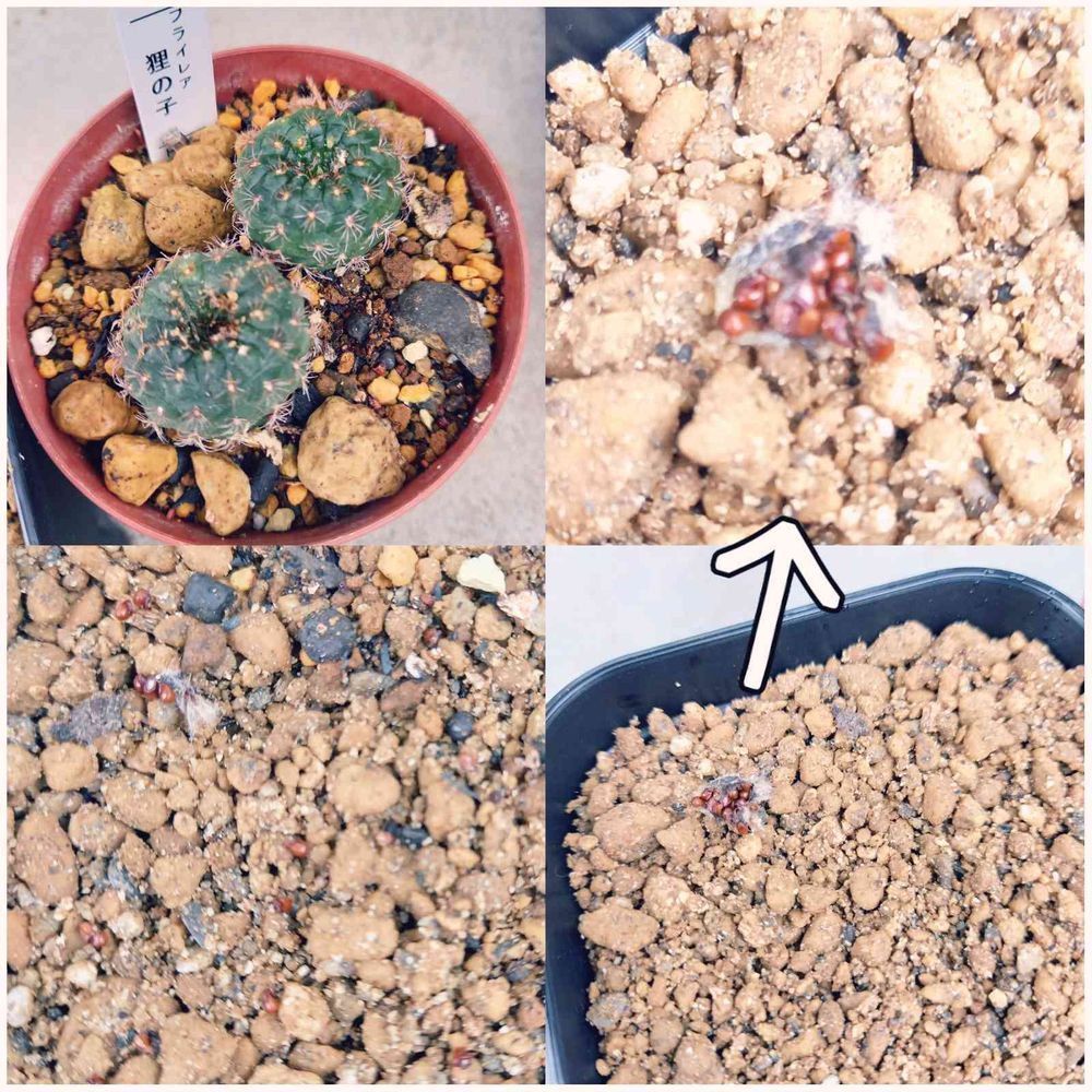 昨日買った小さな🌵フライレア狸の子に花殻があったので触ってみたら「ポロリ」と取れ、中から種?らしきものが沢山出てきました