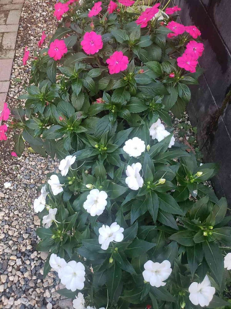ピンクの方、晩夏のころ、葉が落ちて、坊主になり、あきらめたけど、新芽あり、ほっといたら、咲いてくれたのよ。白は、ずーっと、こんな感じで、白いです。ニチニチソウも、元気