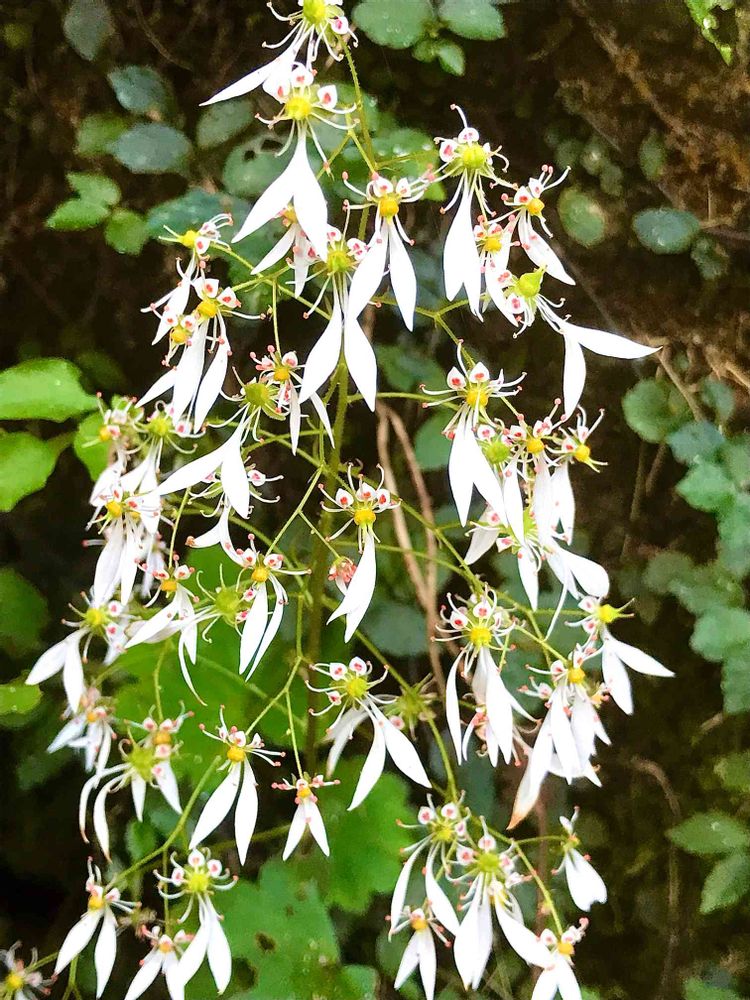 ユキノシタの仲間たちに大文字草などもありますが、人字草の下側二枚の花びらが大きいのが妖精みたいで可愛いです。葉もヒューケラに似た形で育ててみたい花ですが渓流みたいな湿気の多い環境で育つので花壇では難しそうです。