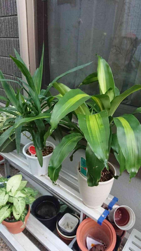 ドラセナ🍀ユッカは春から野外で育てたらドラセナは斑が はっきり出て元気に成長しました。