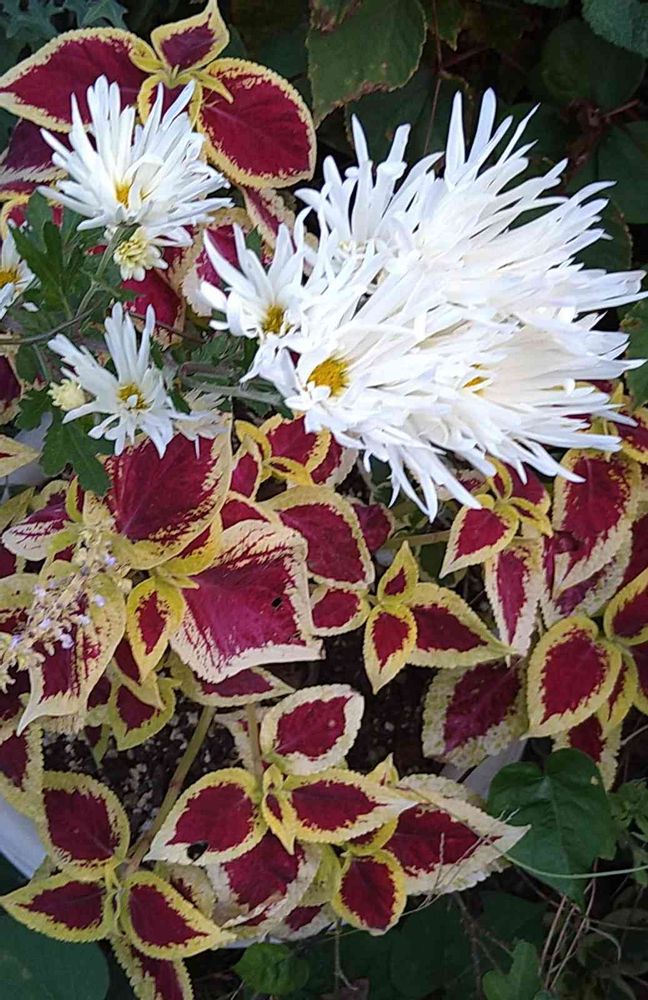 暗渠の上の鉢植え花壇の菊とコリウスのコラボが素敵です。