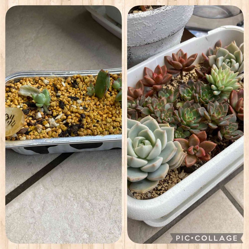 チーズケーキ🧀の入れ物に植えてる葉挿しっ子達。親葉がとうとうジュレたので、外しました😟独り立ちがんばれ👍グリムワン🎵➡️百均のぼろぼろプランターの葉挿しっ子可愛く縁が色付いてます💕ほったらかしなんだけど😆