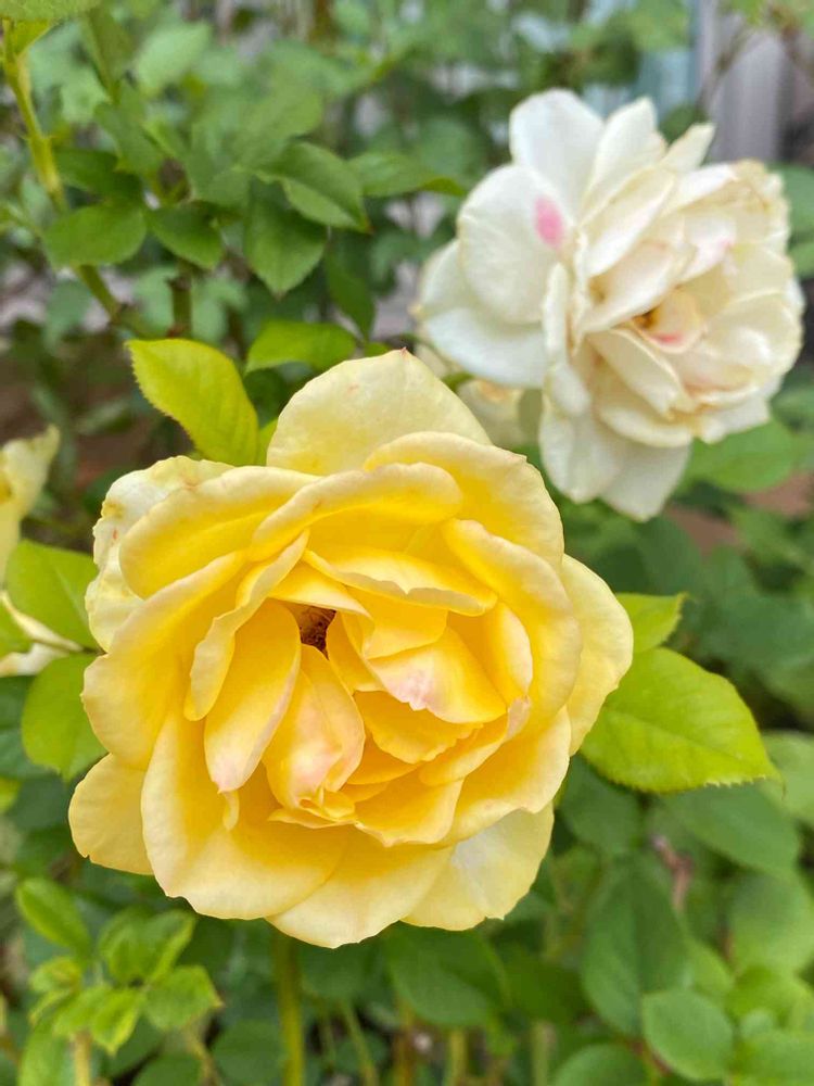 同じ株から、白と黄色のミニ薔薇が咲きました^_^よく見ると白く見えていますがうっすらと黄色味を帯びています😊