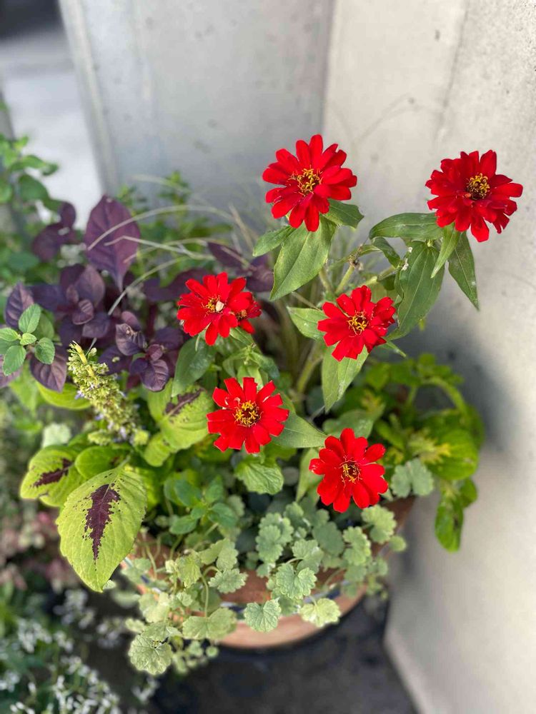 9/29にupした寄せ植え。ジニアは黄色も赤色もうどん粉病になり黄色のジニアは早々とダウン💦そこにカレックスを入れました。赤いジニアはうどん粉病で葉っぱが少ないけどお花は綺麗に咲いてくれてます❤️挿し木でそのまま土に挿したアルテルナンテラとコリウスも元気。1番左のチェリーセージはワサワサになりすぎて写真からはみ出てる😅後ろのパープルのアンゲロニアは花はもう終わりかな〜。別に鉢上げして冬越ししてみようかな🤔
