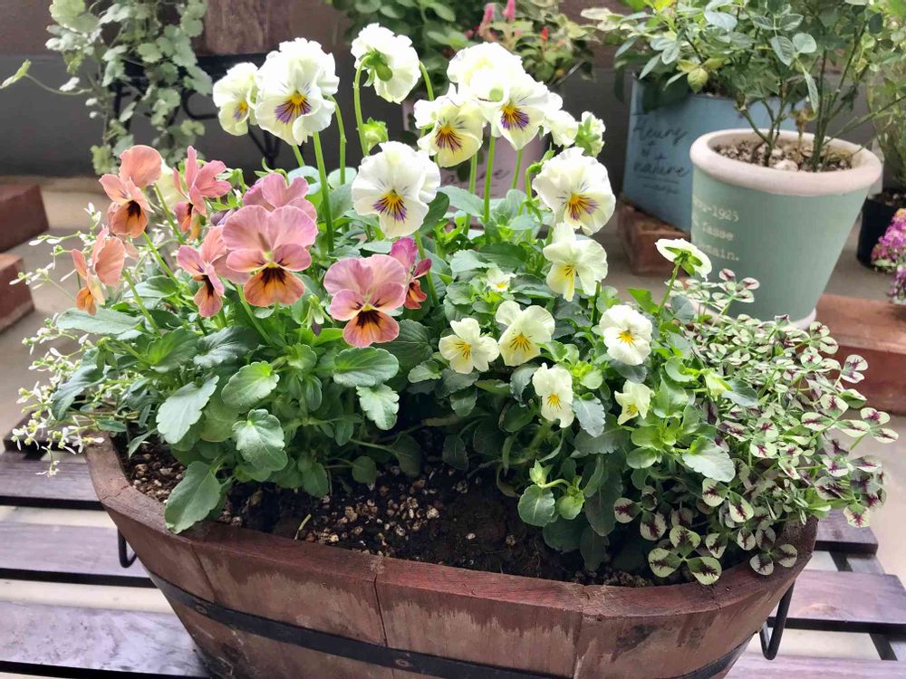 この時期必ず作りたくなるビオラパンジーの寄せ植えです。それぞれが優しい色味の花なので全体姿もやわらかな印象です♡