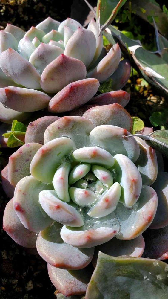 さん、私は多肉花壇、雨の日はビニールをかけ、一度も濡らしていません。七福神が、水がかかるとダメになってしまいます。心配な夜は必ずビニールです。多肉植物1年を迎え、室内に置ききれないので、小さなビニール温室を買いました。また、ビニールはかけていませんが、多肉花壇は毎日ビニールをかけています。千葉は比較的暖かいので、多肉植物が外置きの家を見かけますが、心配で出来ません。昨日のシュシュは、棚置きの七福神で、なかなか好調でした。