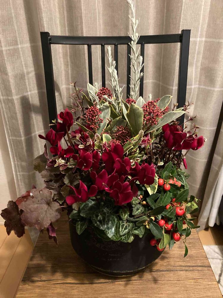 ガーデンシクラメンとスキミアを寄せ植えたくて作りました