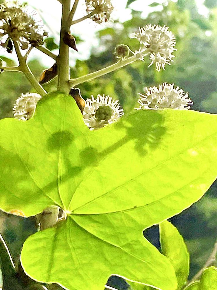 葉に掌状に8個程の深い切れ込みがあり、「八」に数が多いという意味があり、「八手(はっしゅ)」と呼ばれたのが名前の由来。実際は(葉の突出部は3.5.7.9個と奇数)なぜ?〈八つ〉は数ではなく〈多い〉という意味。八は末広がりで縁起の良い数字なので、大きな葉っぱで魔物を追い払う…天狗の団扇…が別名📖。古代より💛🧡🐈🎶仕事へGO!!!