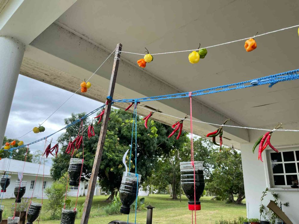 ちょうど青い洗濯紐が強度があるのでそれに乗って唐辛子🌶をちょこっと摘んで食べてました。