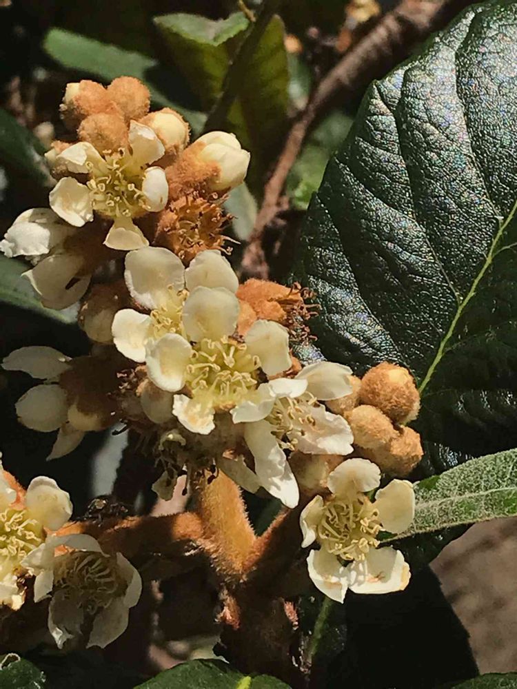 ええ、黄色い実を食べるあのビワです😅。まあ、当然ですが花からは想像が付きません。花は5弁で梅に似ています♪。葉っぱの濃い緑に負けないように薄い黄色の花が綺麗です😊。この辺りでは家にビワの木があるのは珍しくありません。また、林の中に雑木として生えていることも珍しくありません。ただ、そんな木の実は小さくて鳥たちの餌になっています😅。