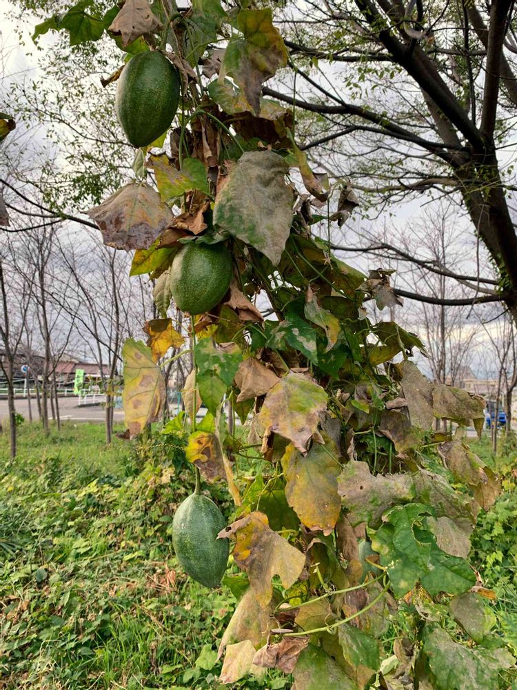庭の木なんですが、、ツルのように伸びていて、ウリのような形の実がなっています。なにかわかるかたいらっしゃいますか?