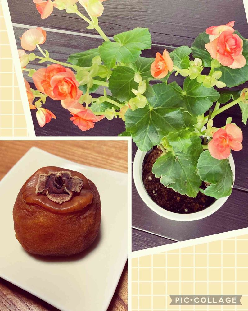 ~美味しそう😋……同じ形の渋柿を選びましたが~これで何日ですか❓……あっ、ベゴニアもキレイな柿色で~~て、頭から干し柿が離れない😅