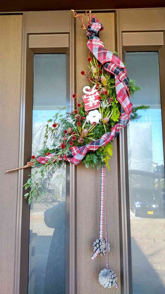 こんにちは😊🌤️🎶 今日は今週アレンジメント教室で作ってきたクリスマスリースをアップします👍💕 チェックの布を私はねじるようにしてこのような形にしてみました。チェックの使いかた各々に個性ありましたよ。ハート形にしてたりリボンの形にしてた人もいました。