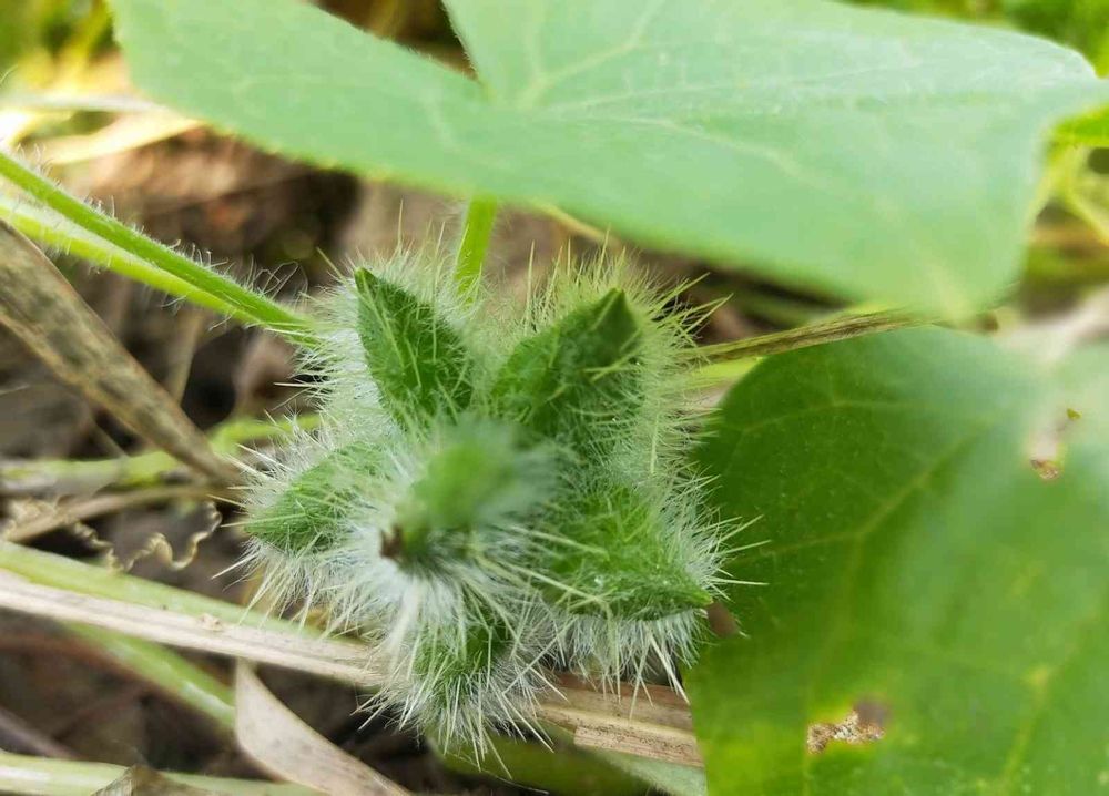 雄花は クーンと伸びて咲くけど、雌花はこの写真で実が葉っぱの下に隠れているように 葉っぱの下に咲くので ちょっと気付きにくいかもしれないですね。