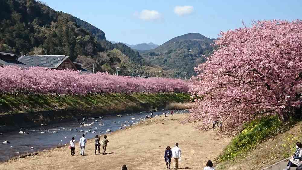 本物の川津桜は、やっぱり違いますね。両脇の道全部川津桜でつながってますね。