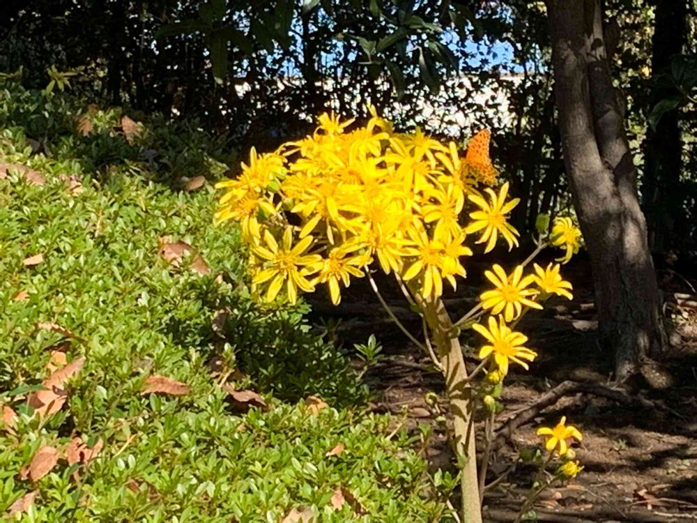 ツワブキとヒョウモン蝶。のどかな秋の風景です🙂