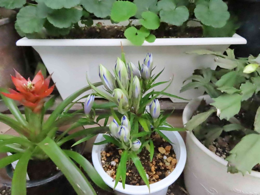 リンドウさん、両隣にグズマニアさんとデンマークカクタスさんも、仲良く並んでますね😊