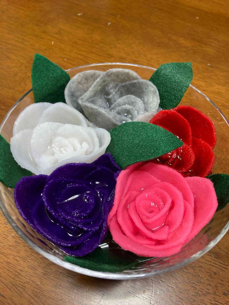 フェルトでバラの花を作り、水を吸わせます。昨日のお稽古で習いました。これは先生の見本用です。