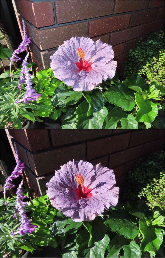 朝日に照らされた「ハイビスカス デニムブルー」 パチリ・パチリ