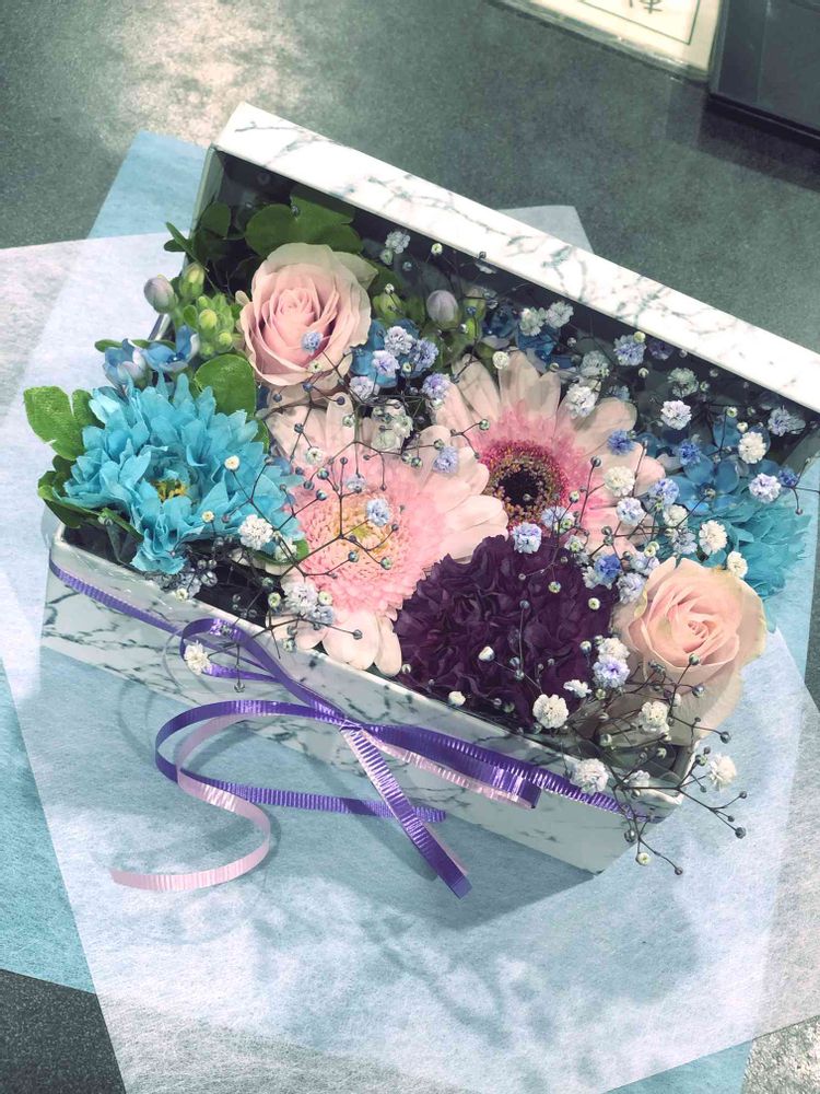 お客様より、お持ち込みのBoxと水色の造花を使って、他は生のお花でアレンジメントを作って欲しいと🌸