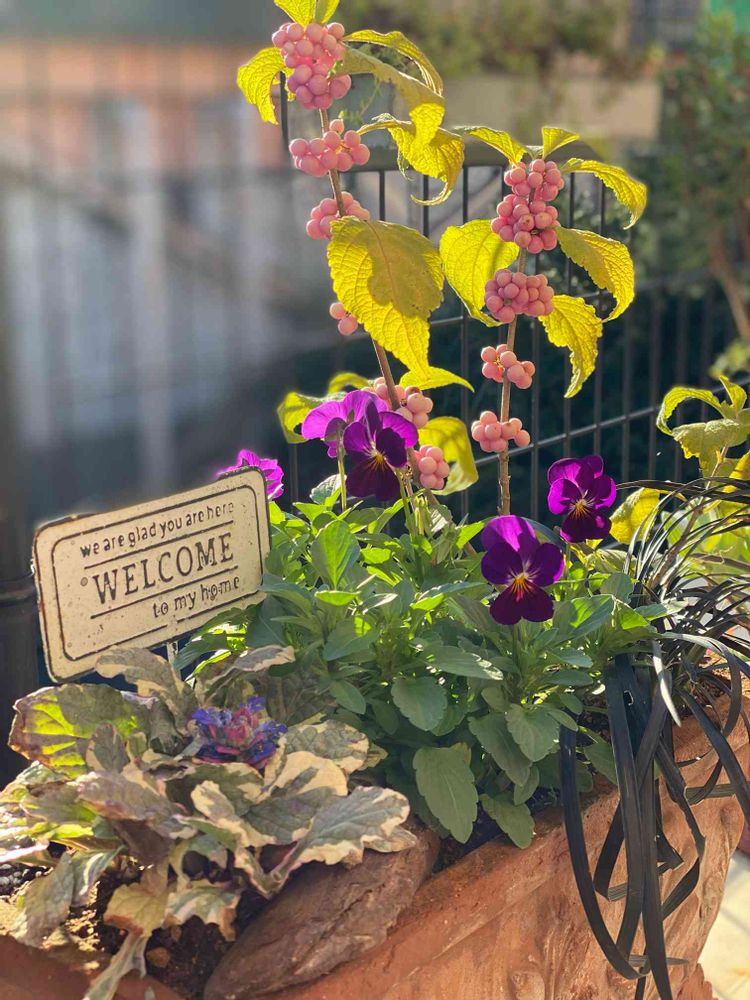 前回投稿のビオラと桃式部の寄せ植えの全体画像です。アジュガも葉色の種類が豊富ですよね♪黒竜も大好き💕