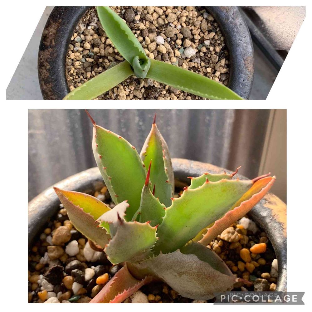 下…昨日。葉数も少しずつ増えてきました。鉢が小さいから?まだ手のひらサイズ🪴 外葉の少し粉っぽい感じも😍