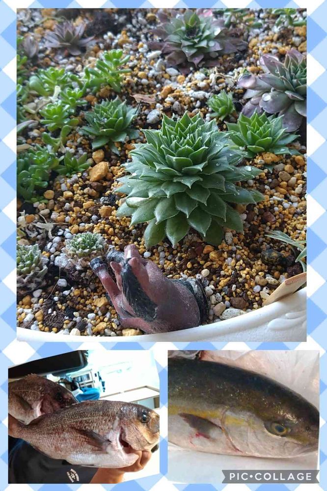 下のpicは、海上釣り堀で釣ってきた魚(かんぱちは鯛3尾と物々交換したらしい)ので、釣果は鯛5尾とフグでした🐡