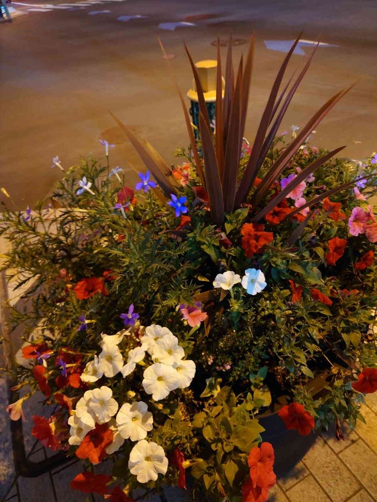 だいぶ寒くなりました。街灯を受けた寄植えは、色みが違ってみえます。