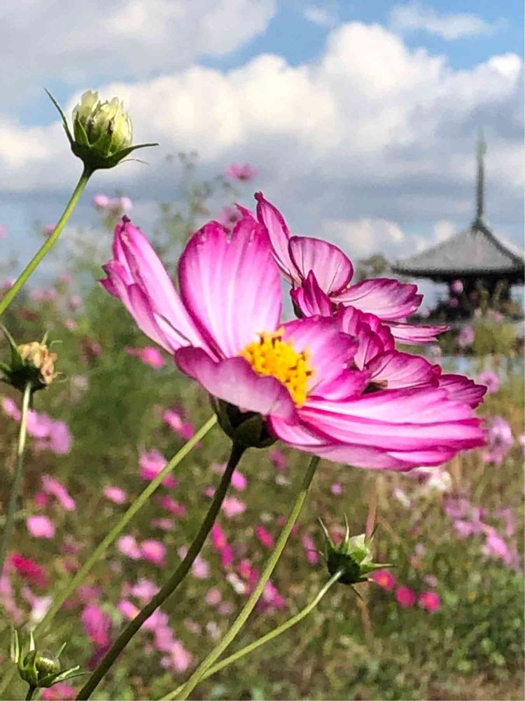 ちゃん、メッチャ綺麗なコスモスと雲と遠くのお寺の構成が良いわ💕