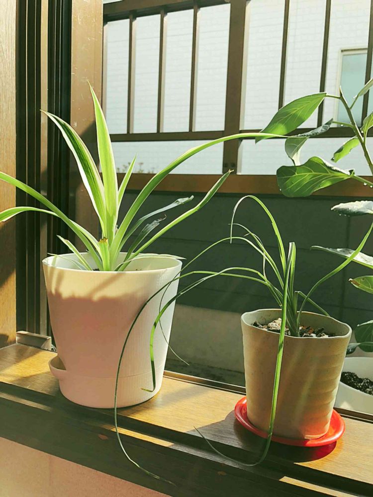 オリヅルラン姉ちゃんは家に連れて帰ってすぐに植え替えをし、休ませている間におこにむしゃむしゃと食べられて、初っ端からボロボロになった。それから1ヶ月。少しずつ盛り返している。