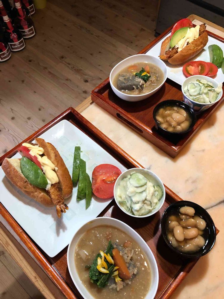 フランスパン🥖、海老フライ🦐、トマト、アボカドサンド🥑