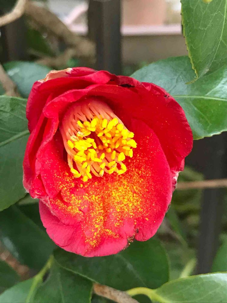 椿の花がどんどん咲き出して来た。花粉が花びらに落ちて綺麗な彩りになっている。