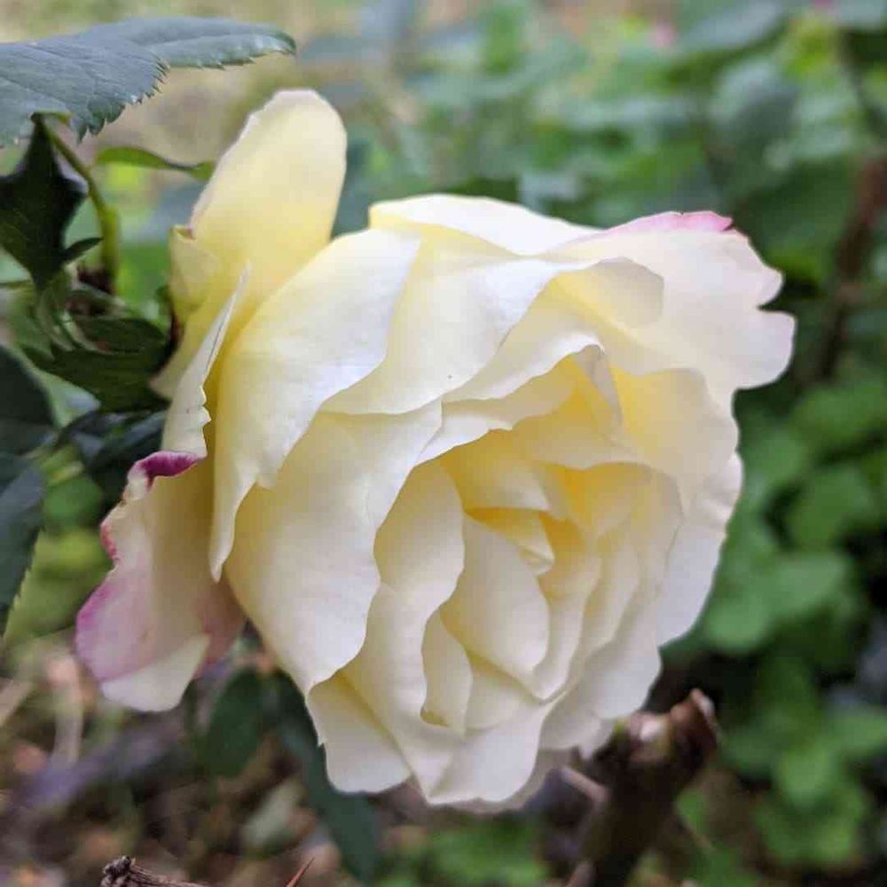 頑張って細い枝から蕾を膨らませて咲きました♡色が変化するダブルデライト🌹です。これから赤く色づきます。香りもパフュームみたいで香り高い❣